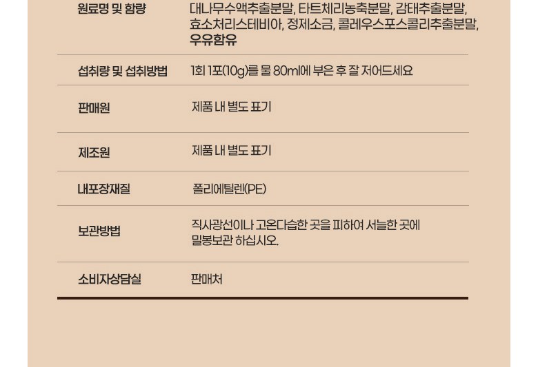 | 포장단위별 내용물의 용량(중량), 수량 | 100g(10gX10포) | 원재료명 및 함량 | 상품 상세페이지 참조 |