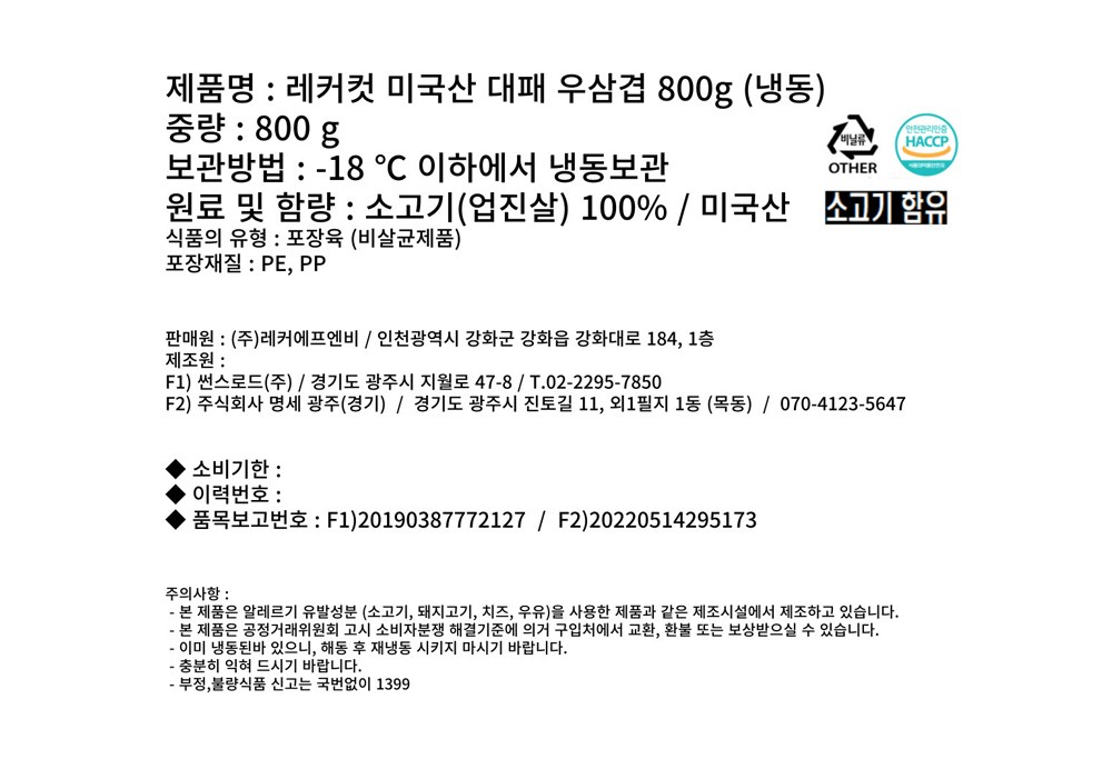 | 제조연월일, 소비기한 또는 품질유지기한 | 소비기한(또는 유통기한) : 2027년 02월 22일 이거나 그 이후인 상품 제조년월일 : 2026년 02월 23일 이후인 제조상품 | 세부 품목군별 표시사항 | 축산물 등급표시 : 해당 없음 / 이력번호 표시유무 : 이력번호 표시제품임 |