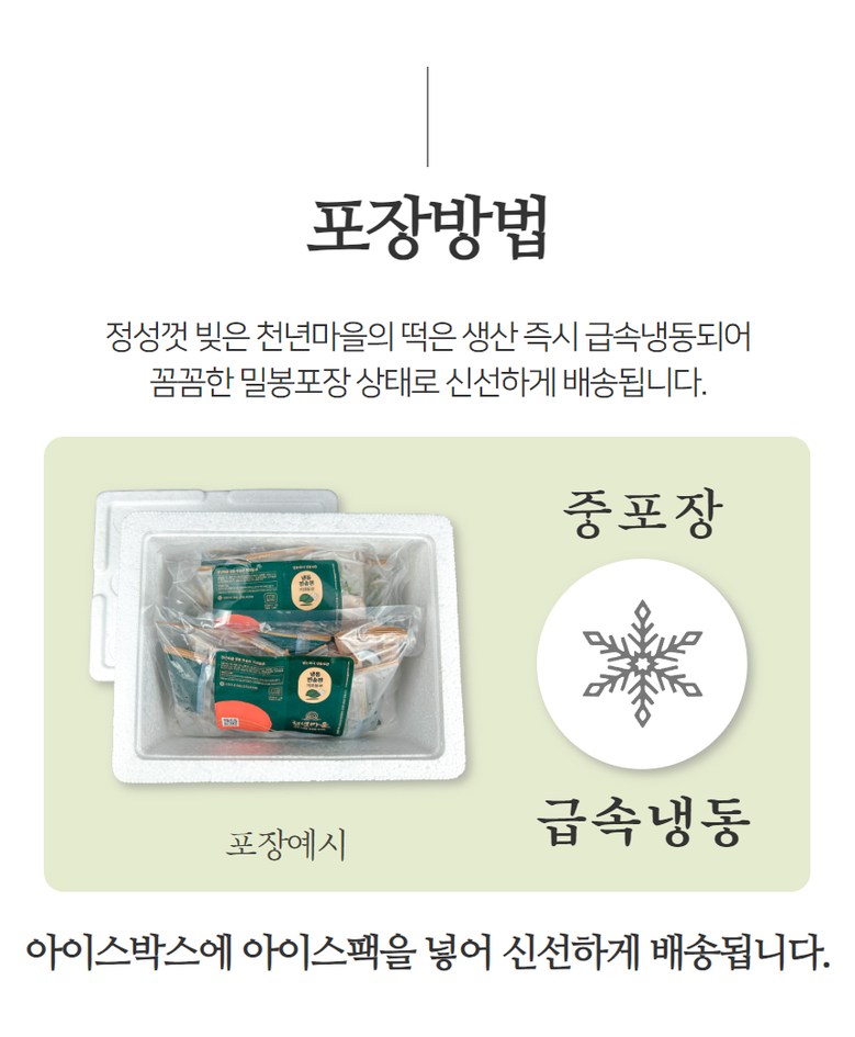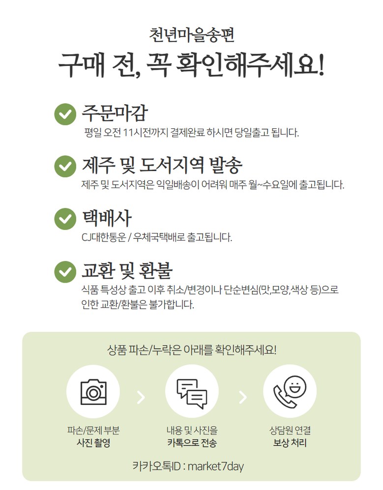 | 배송방법 | 신선/냉장/냉동 | 배송비 | 무료배송 - 도서산간 지역 배송불가 |