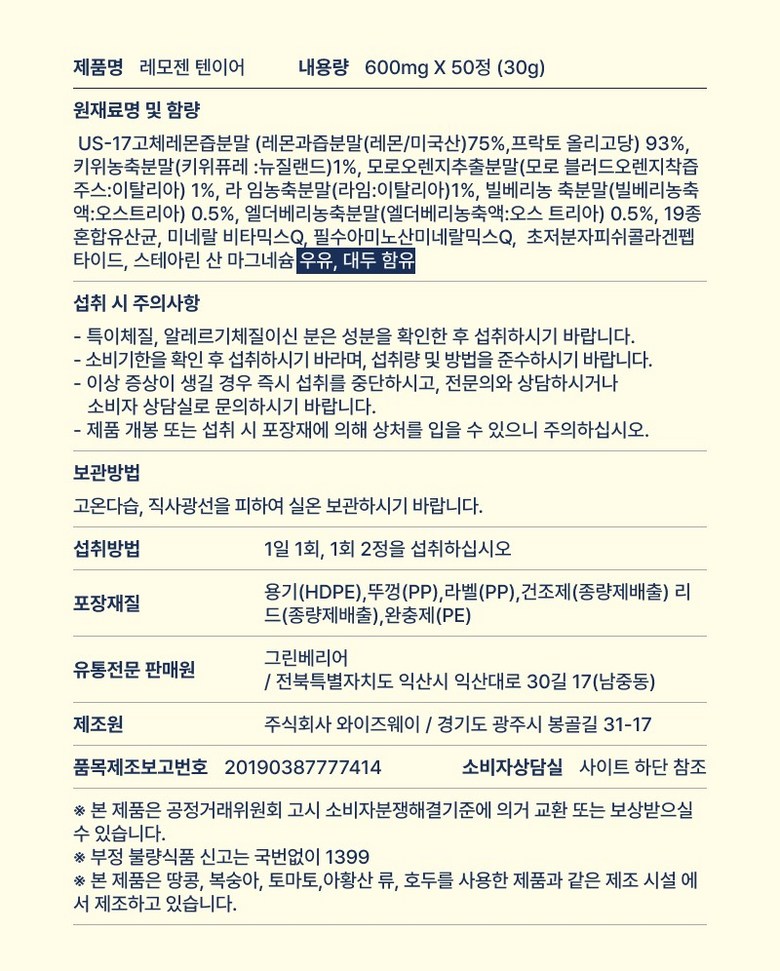 | 원재료명 및 함량 | 상품 상세페이지 참조 | 영양성분 | 상품 상세페이지 참조 |