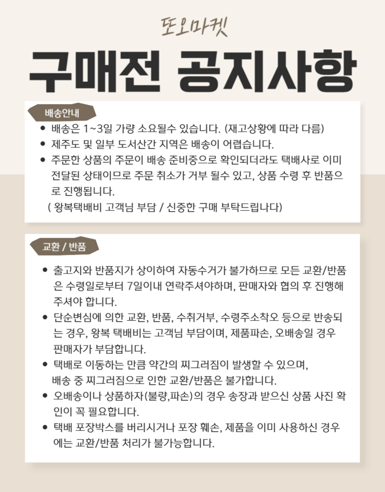 - ㆍ모니터 해상도의 차이로 인해 색상이나 이미지가 실제와 달라, 고객이 단순 변심으로 교환/반품을 무료로 요청하는 경우