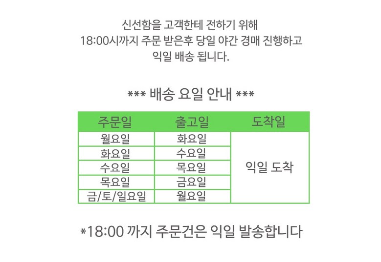 | 배송기간 | ㆍ도서산간 지역 등은 배송에 3-5일이 더 소요될 수 있습니다. - 천재지변, 물량 수급 변동 등 예외적인 사유 발생 시, 다소 지연될 수 있는 점 양해 부탁드립니다. | ||