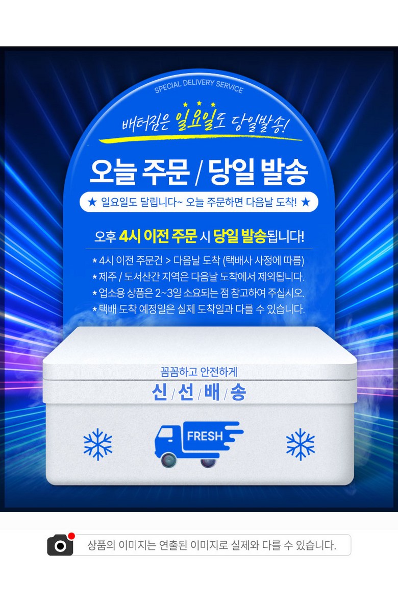 | 배송방법 | 신선/냉장/냉동 | 배송비 | 무료배송 · 도서산간 추가 배송비 - 제주 지역: 5,000원 - 도서산간 지역: 3,000원 |