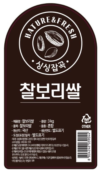 | 품목 또는 명칭 | 월드그린 찰보리쌀 | 포장단위별 내용물의 용량(중량),수량,크기 | 3kg, 1개 |