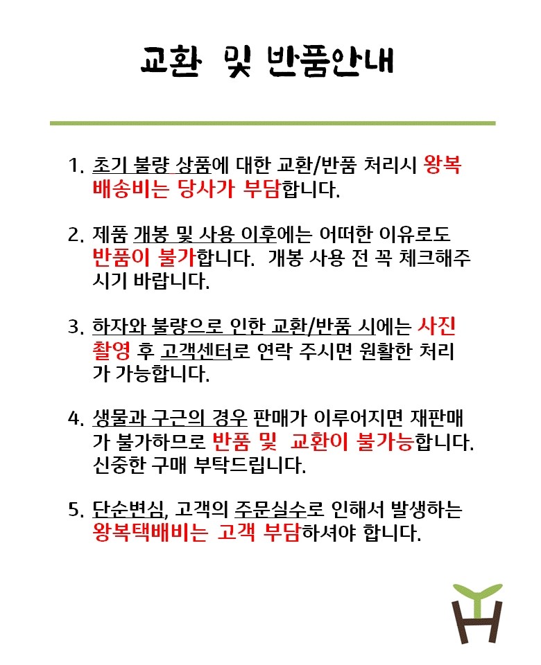 - ㆍ모니터 해상도의 차이로 인해 색상이나 이미지가 실제와 달라, 고객이 단순 변심으로 교환/반품을 무료로 요청하는 경우