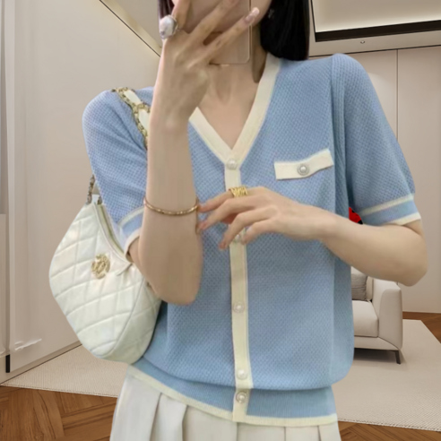 미중 여성 여름 뉴 빅사이즈 트위드 텐셀 니트 가디건 얇은 박시 브이넥 반팔 yf