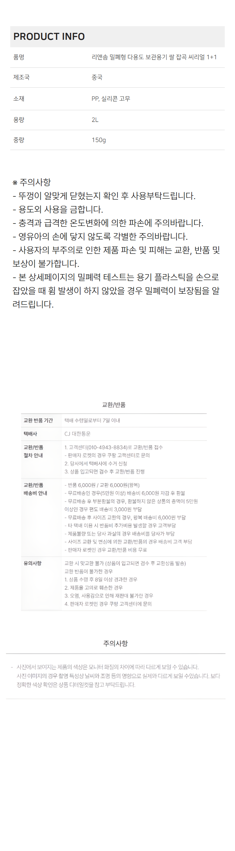- ㆍ모니터 해상도의 차이로 인해 색상이나 이미지가 실제와 달라, 고객이 단순 변심으로 교환/반품을 무료로 요청하는 경우