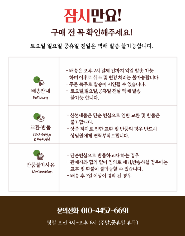 - ㆍ모니터 해상도의 차이로 인해 색상이나 이미지가 실제와 달라, 고객이 단순 변심으로 교환/반품을 무료로 요청하는 경우