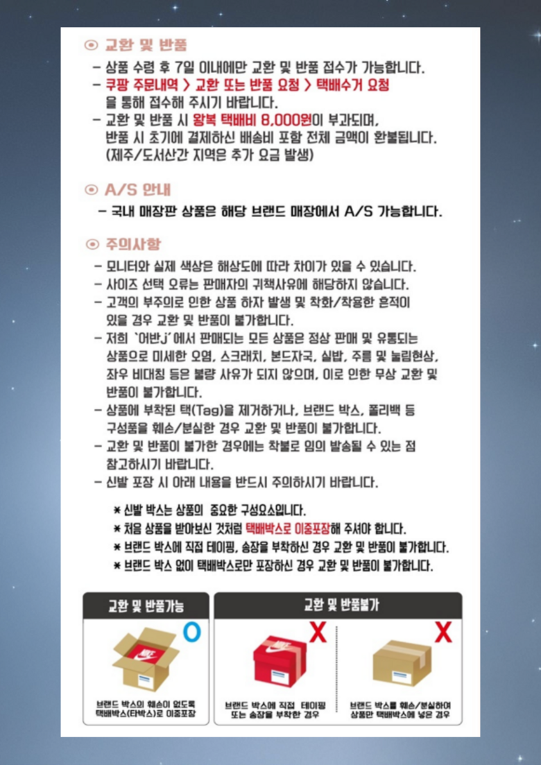 | 교환/반품 비용 (왕복비용) | 8,000원 - 단, 고객 변심의 경우에만 발생 - 도서산간 지역 배송불가 |
