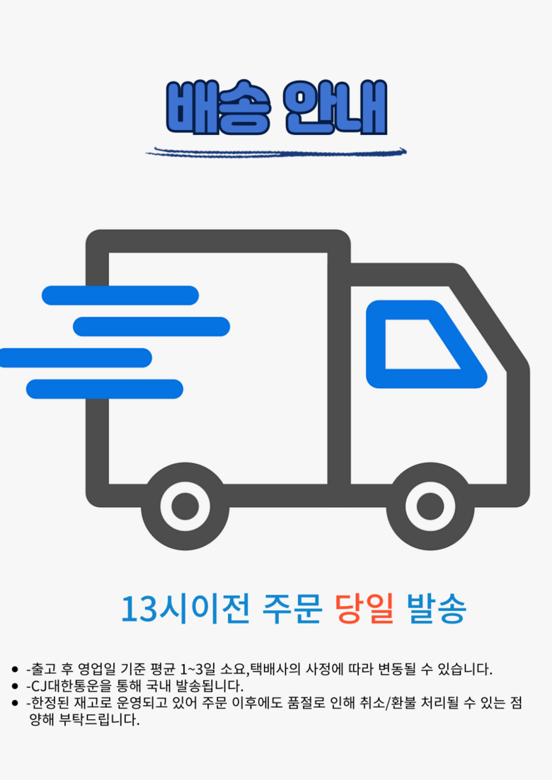 | 배송기간 | ㆍ도서산간 지역 등은 배송에 3-5일이 더 소요될 수 있습니다. - 천재지변, 물량 수급 변동 등 예외적인 사유 발생 시, 다소 지연될 수 있는 점 양해 부탁드립니다. | ||