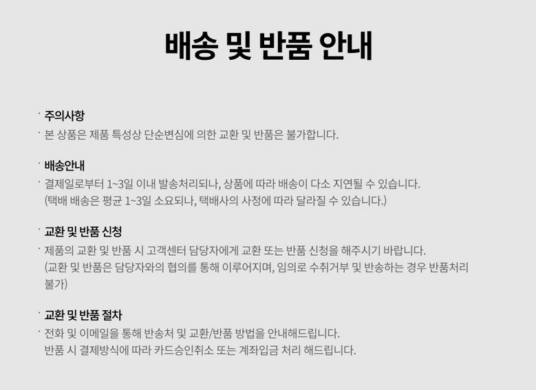 - ㆍ교환/반품에 관한 일반적인 사항은 판매자가 제시사항보다 관계법령이 우선합니다.
