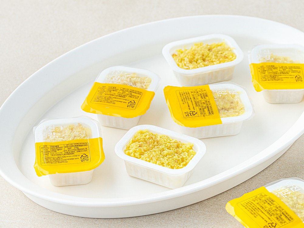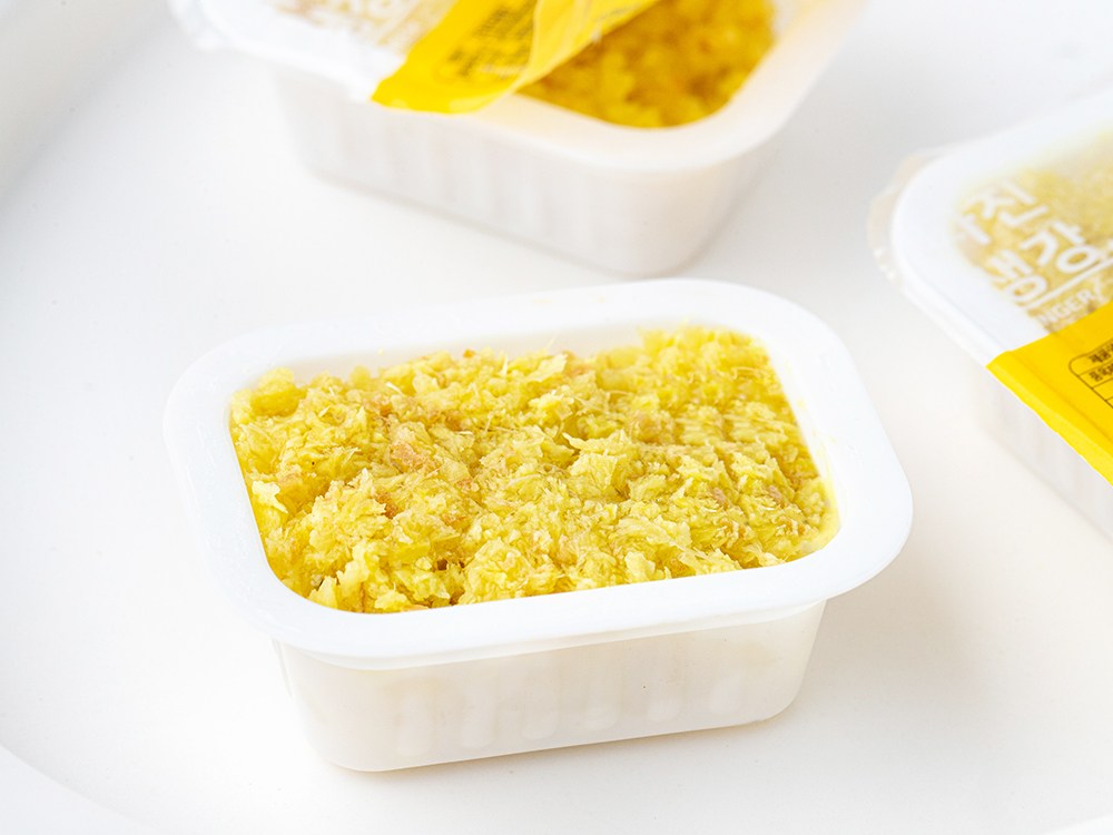 손쉽게 사용할 수 있도록 곱게 다진 생강이에요. 큐브 형태로 한 개씩 포장되어 있어서 필요한 만큼만 꺼내 쓸 수 있고 보관이 간편해요. 생강 특유의 알싸하고 향긋한 풍미가 고기와 생선 요리의 비린 맛을 잡아준답니다. 설탕을 넣어 생강청으로 활용해도 달콤하고 맛있어요.