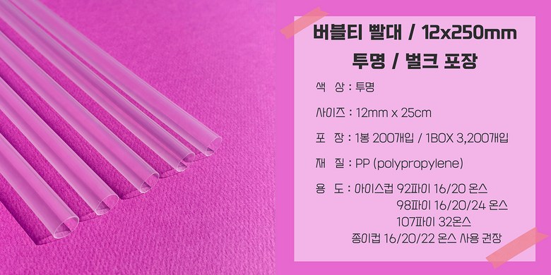 | 품명 및 모델명 | 버블티 빨대 12*250mm 투명 벌크포장 200개 | 재질 | PP(Polypropylene) |
