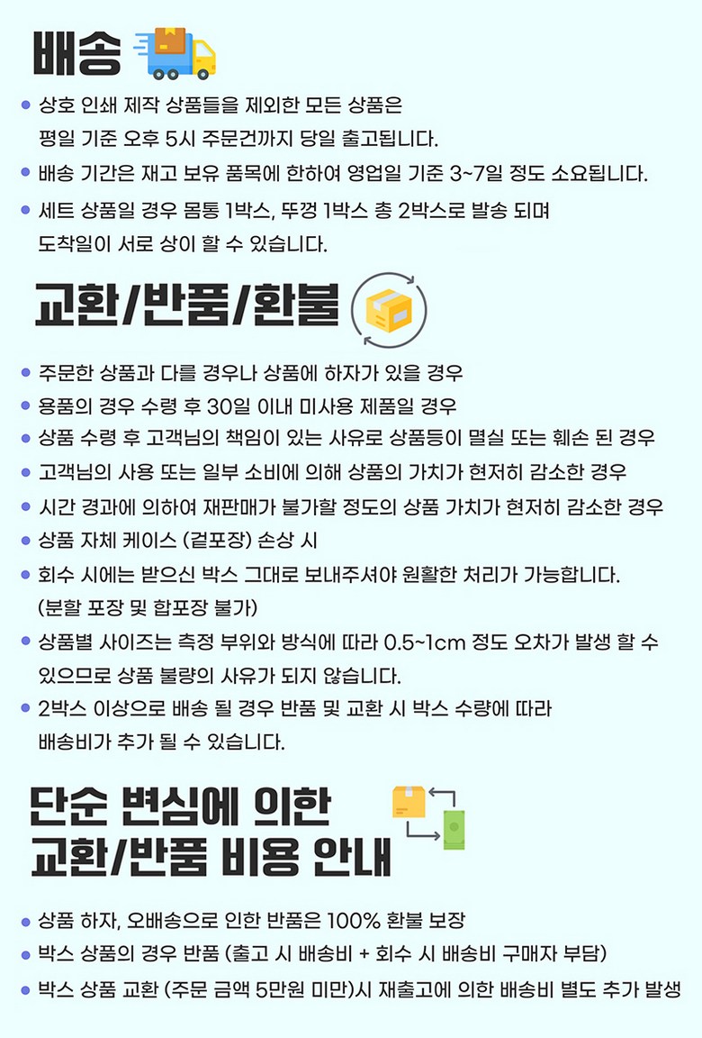 - ㆍ모니터 해상도의 차이로 인해 색상이나 이미지가 실제와 달라, 고객이 단순 변심으로 교환/반품을 무료로 요청하는 경우