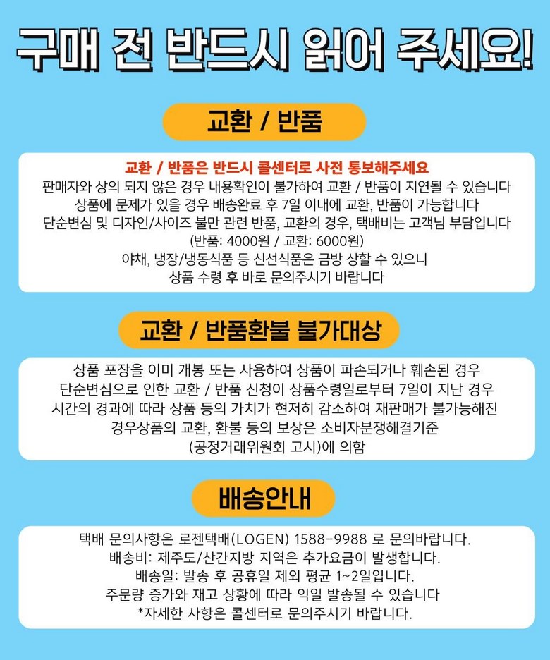 - ㆍ교환/반품에 관한 일반적인 사항은 판매자가 제시사항보다 관계법령이 우선합니다.