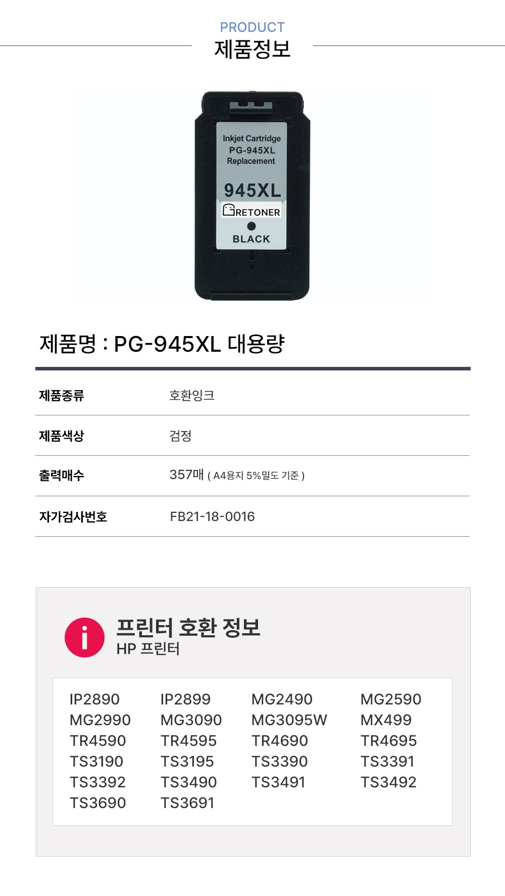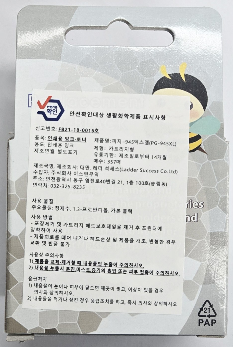 | 품목 및 제품명 | 인쇄용 잉크ᆞ토너 / 피지-945엑스엘(PG-945XL) | 용도(표백제의 경우 계열을 함께표시) 및 제형 | 인쇄용 잉크 / 카트리지형 |