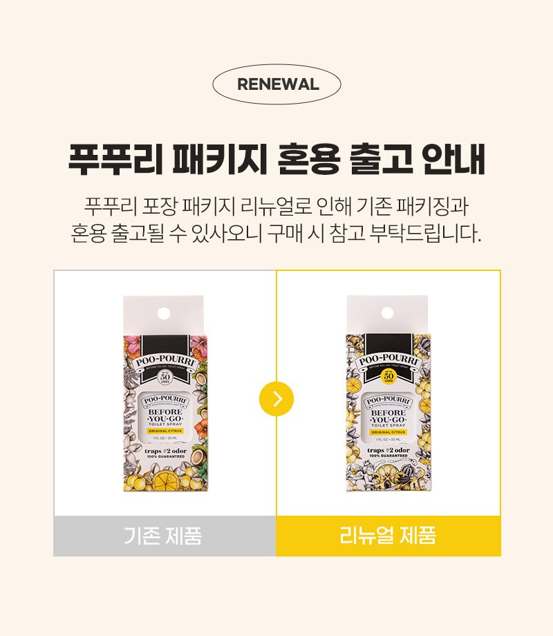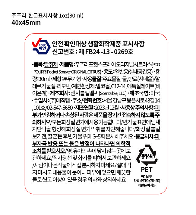 | 품목 및 제품명 | 탈취제 / 푸푸리 포켓스프레이 오리지널시트러스 (POO-PURRI Pocket Sprayer ORIGINAL CITRUS) | 용도(표백제의 경우 계열을 함께표시) 및 제형 | 일반용(실내공간용) / 분무기형 |