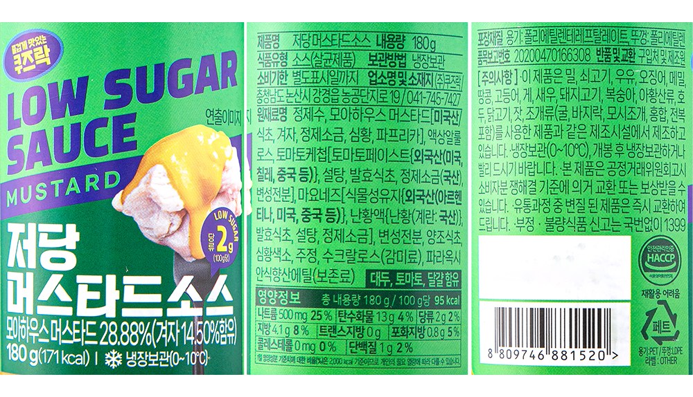 당이 높아 소스 구매를 망설이셨다면, 쿠즈락의 저당 머스타드소스를 선택해보세요. 액상알룰로스를 사용해 깔끔한 단맛을 느낄 수 있어요. 특유의 톡 쏘는 풍미에 마요네즈로 부드러움을 채웠답니다. 닭가슴살, 훈제오리와 특히 잘 어울리니 밋밋했던 식단에 활용해보세요.