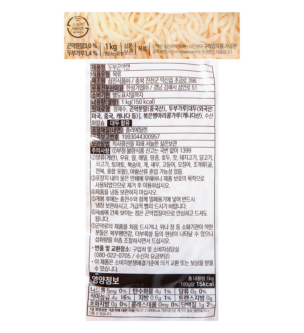 곤약분말, 두부가루를 넣고 반죽한 두부곤약면이에요. 쉽게 붇지 않고 탱글탱글해, 뜨거운 요리에 넣어도 맛있답니다. 헹구거나 삶을 필요가 없어 간편하게 사용할 수 있어요. 색다른 면 요리가 당길 때 사용해보세요.