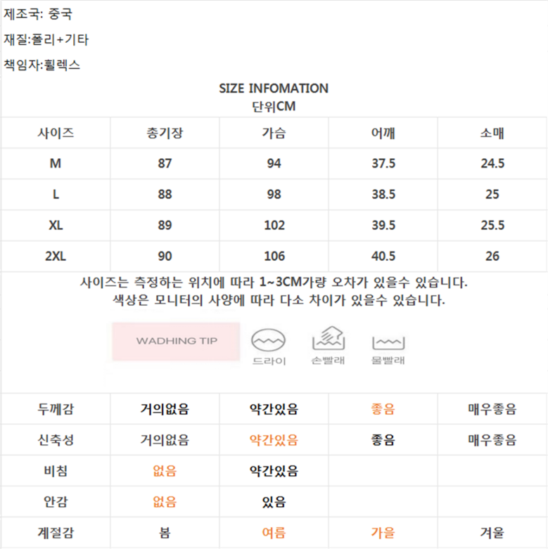 | 제조국 | 중국 | 세탁방법 및 취급시 주의사항 | 상품 상세페이지 참조 |