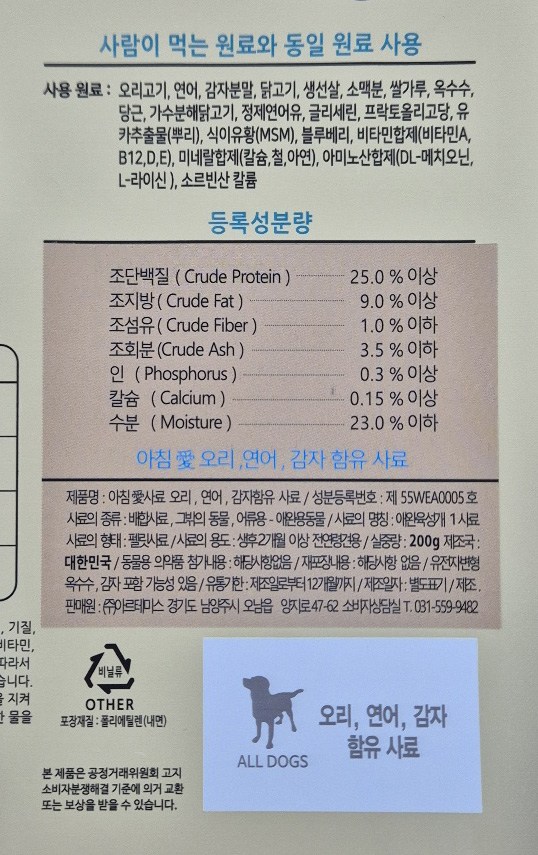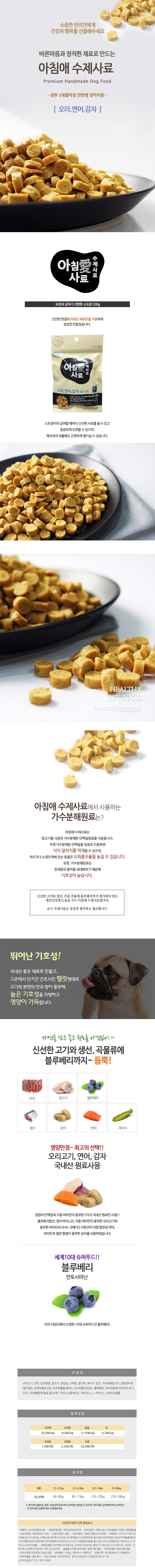 | 품명 및 모델명 | 아침애사료 수제사료 오리연어감자함유 사료 | 인증/허가 사항 | 사료관리법에 따른 성분등록번호 : 컨텐츠 참조 |