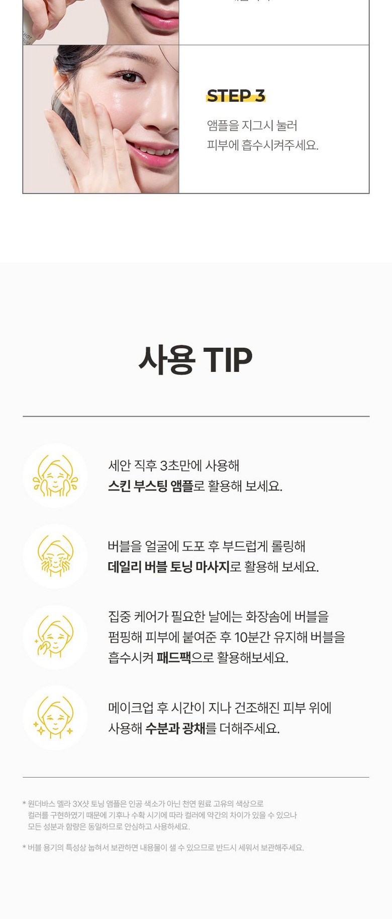 | 사용기한 또는 개봉 후 사용기간 | 개봉전 30개월, 개봉후 12개월 | 사용방법 | 토너로 피부 결을 정돈한 다음, 본 품 적당량을 취해 피부에 골고루 펴발라 흡수시켜 줍니다. 쫀쫀한 제형으로 피부를 끌어올리며 마사지하시면 더욱 효과적입니다. |