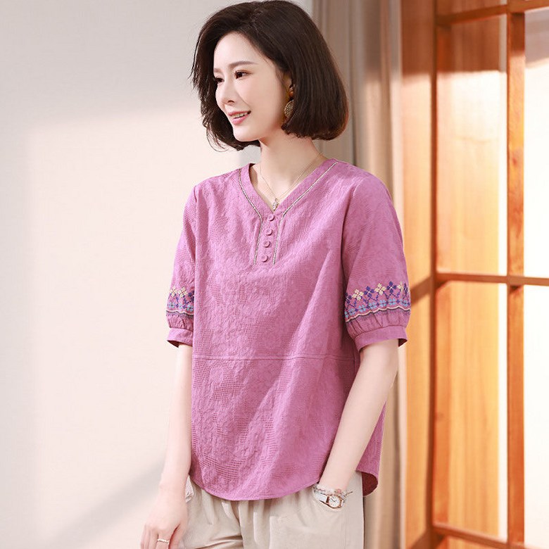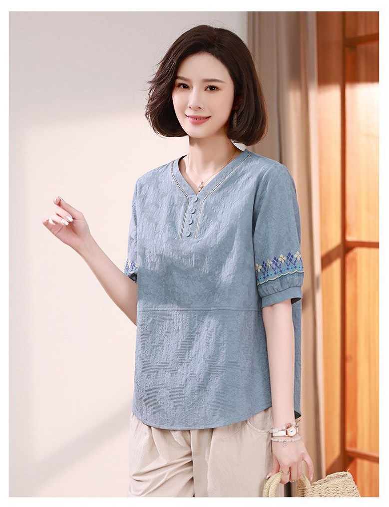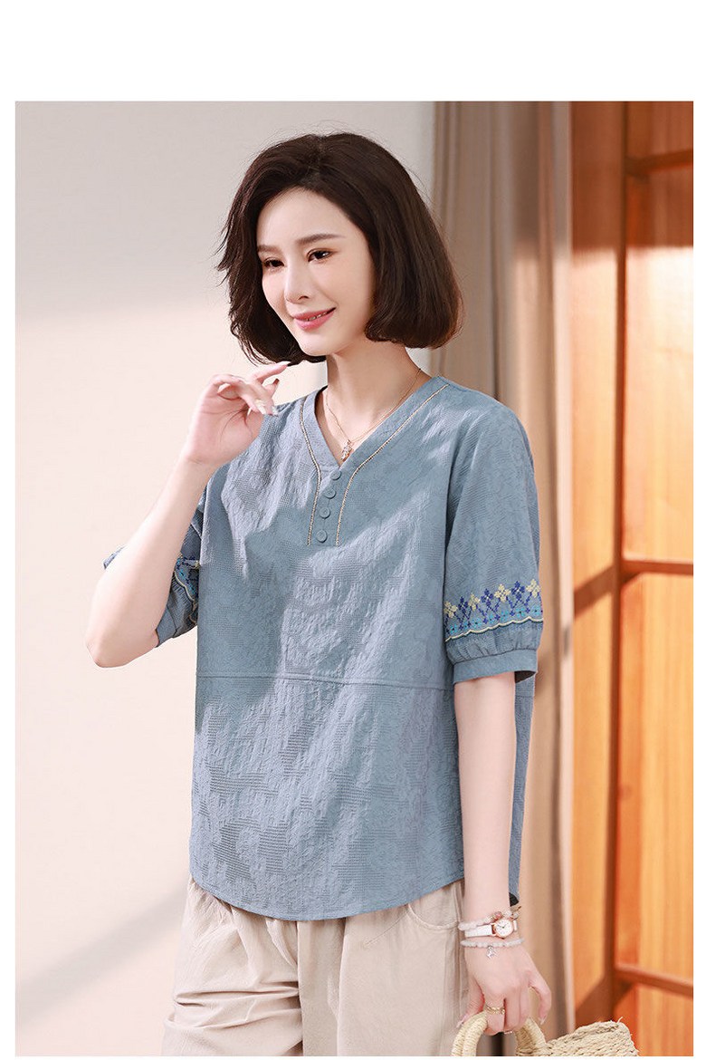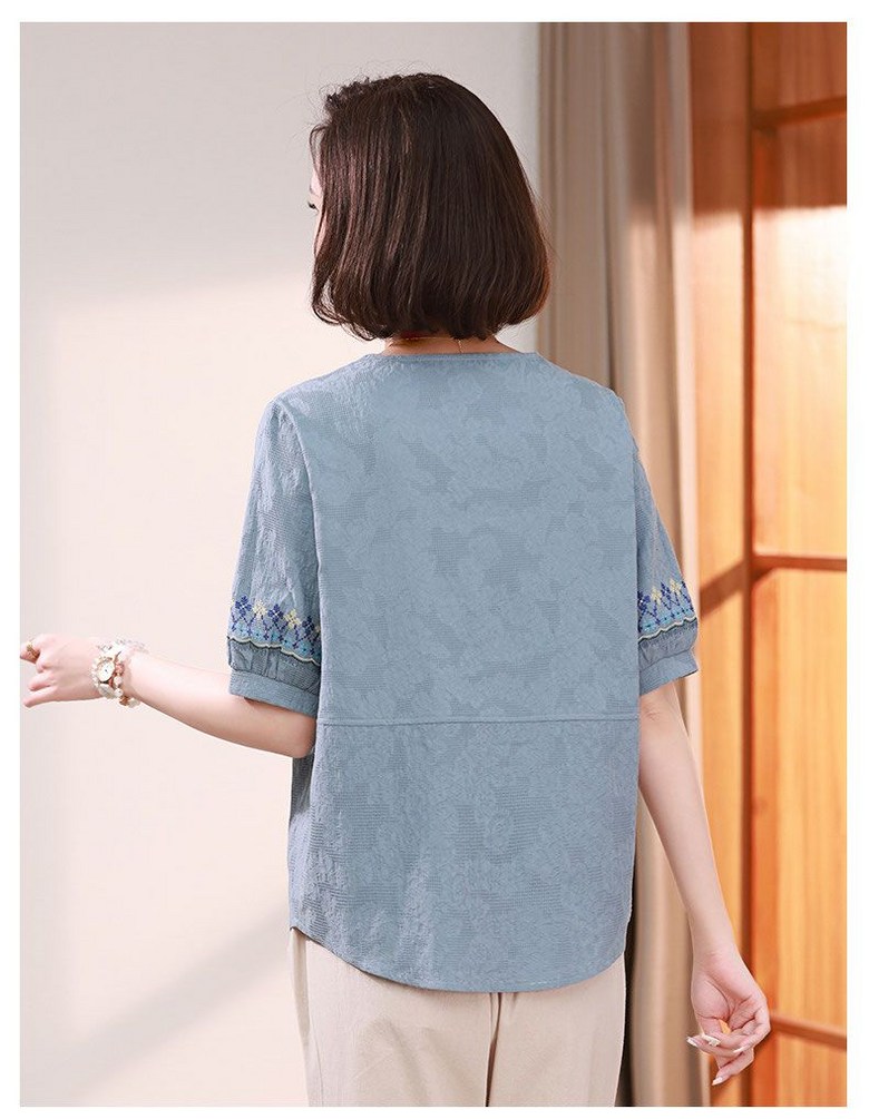 중년 여자 반팔티 편안한 반오픈 디자인 자수 소매 캐주얼 블라우스