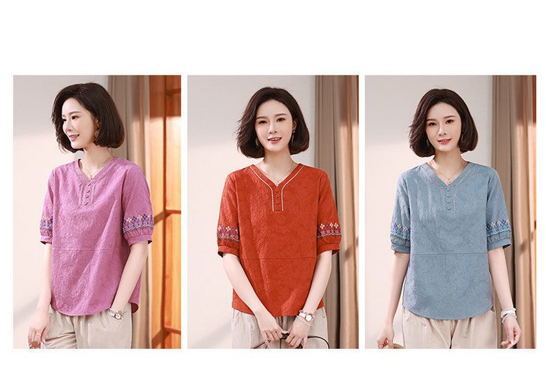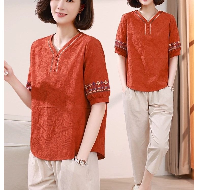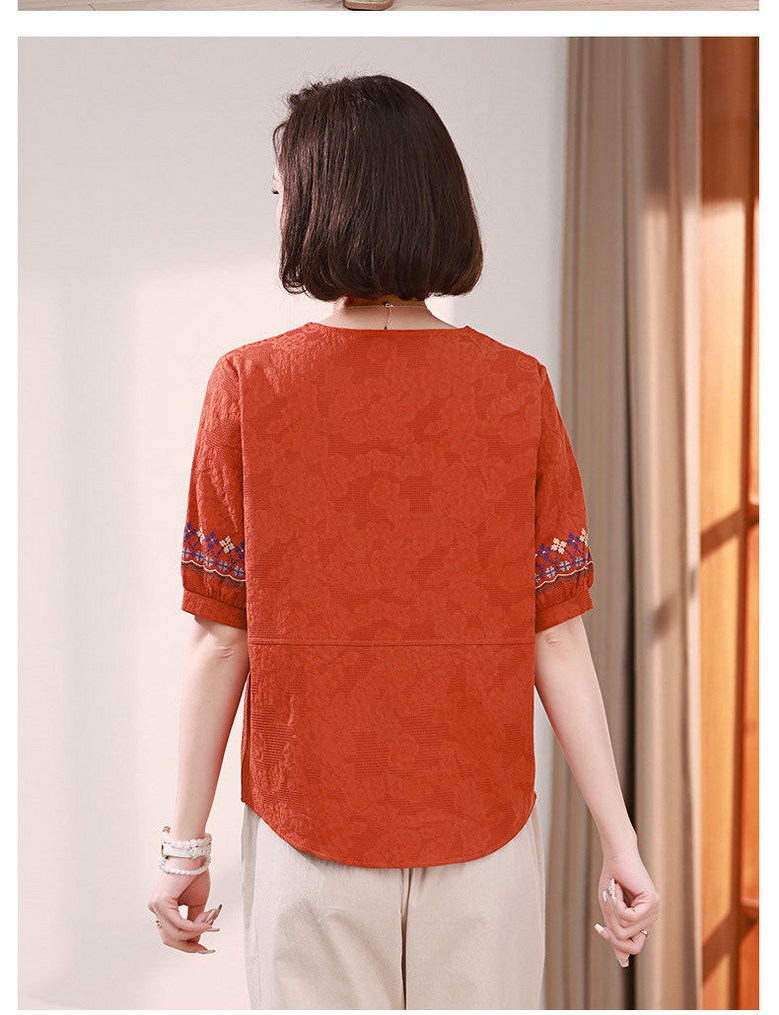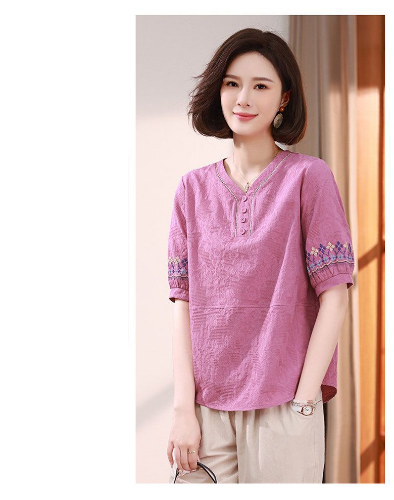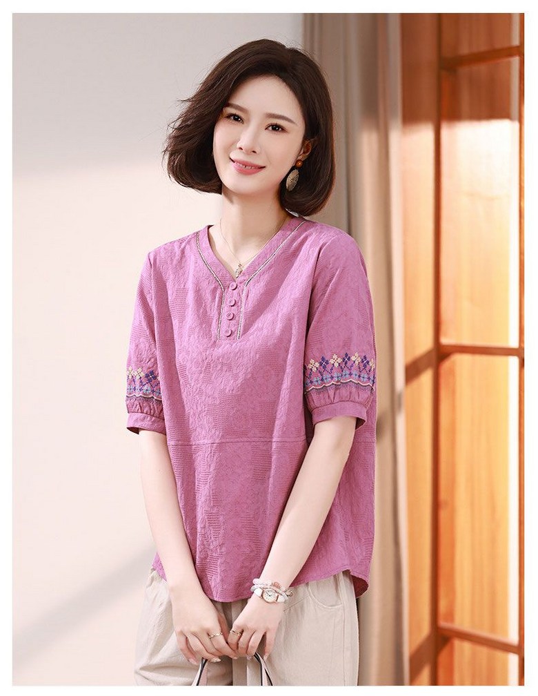 중년 여자 반팔티 편안한 반오픈 디자인 자수 소매 캐주얼 블라우스