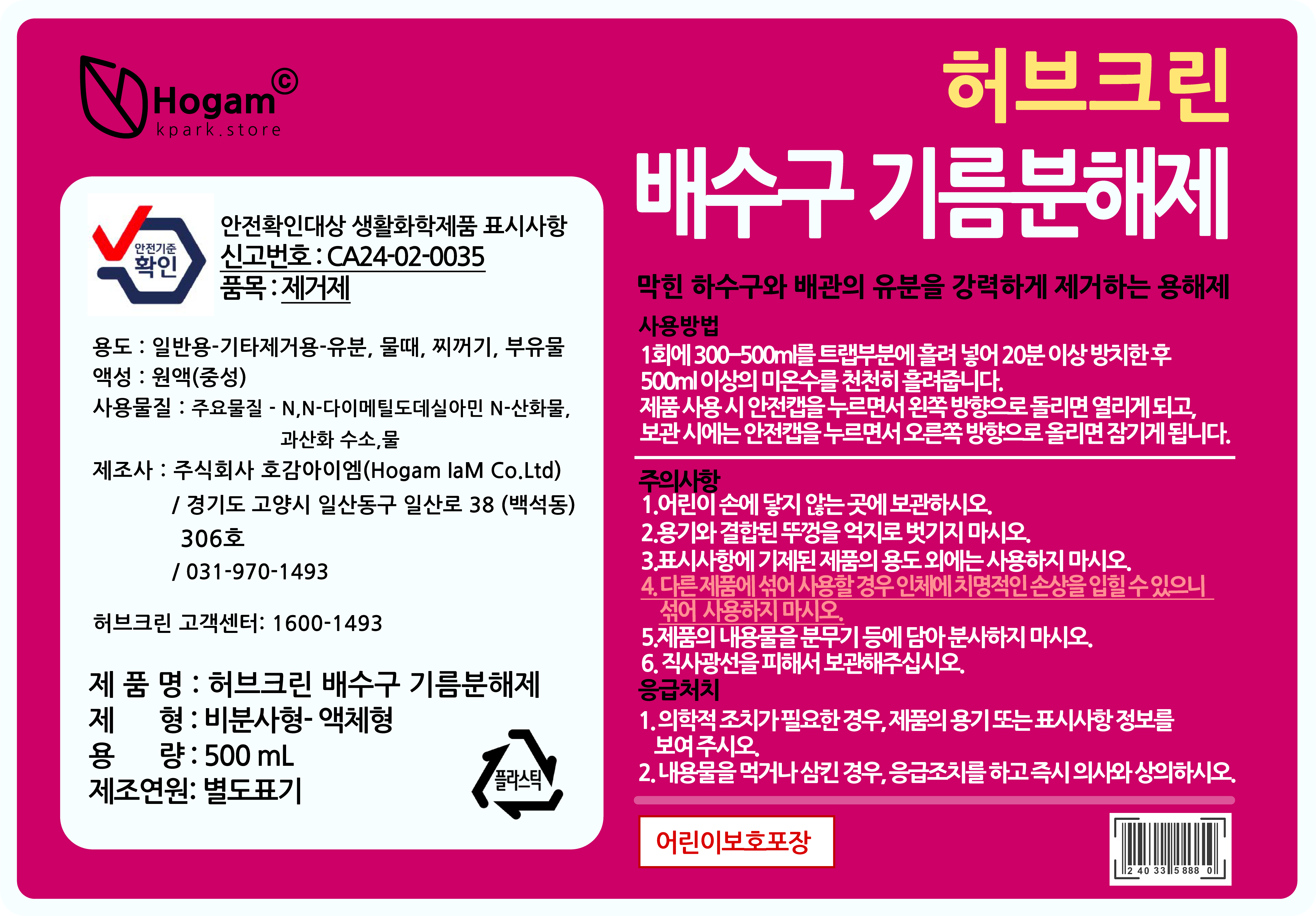 | 품목 및 제품명 | 제거제 / 허브크린 배수구 기름분해제 | 용도(표백제의 경우 계열을 함께표시) 및 제형 | 일반용-기타제거용-유분, 물때, 찌꺼기, 부유물 / 액체형 |