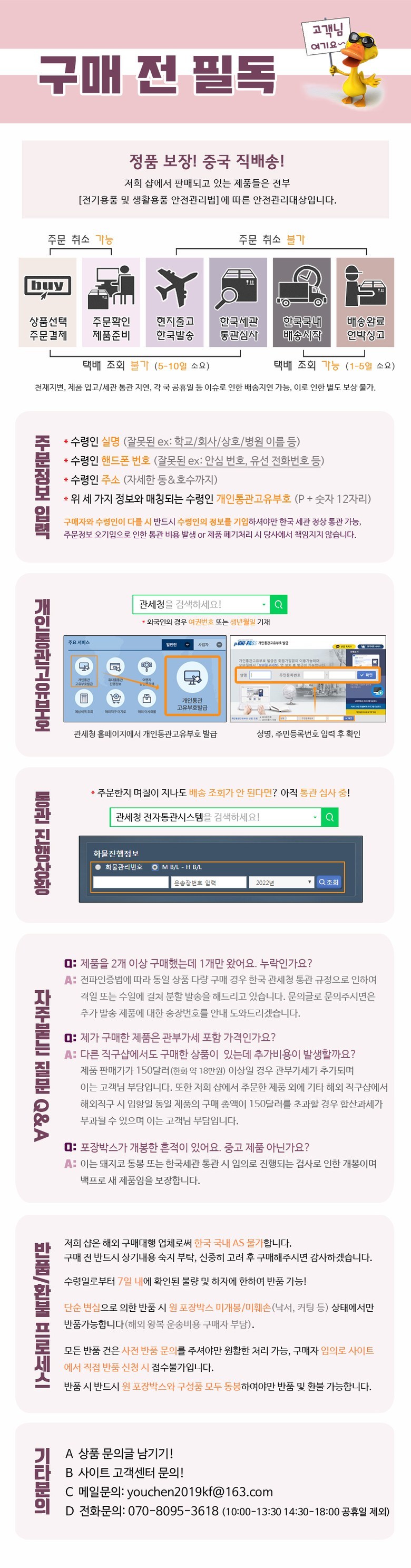 - 상품문의 및 후기게시판을 통해 취소나 환불, 반품 등은 처리되지 않습니다.