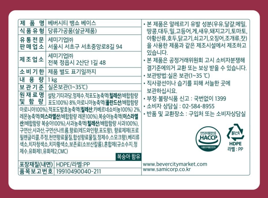 | 포장단위별 내용물의 용량(중량), 수량 | 1kg x 3개 | 원재료명 및 함량 | 컨텐츠 참조 |