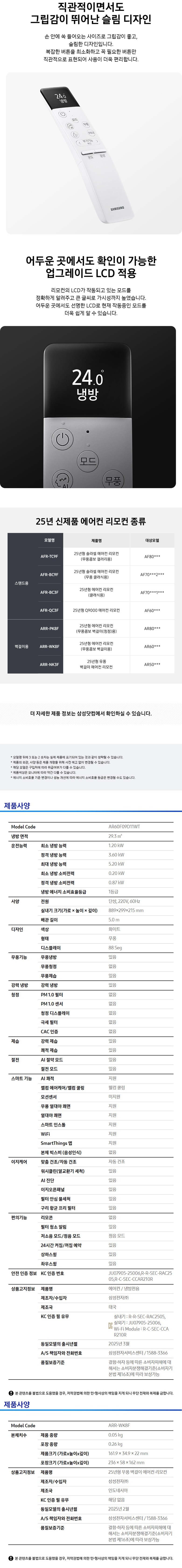 | 품명 및 모델명 | 삼성전자 29.3㎡(8.9평) AI 무풍콤보 벽걸이 에어컨 AR60F09D11WT / 실내기 : AR60F09D11WN, AR60F09D11WNKOㅣ실외기 : AR60F09D11WX | KC 인증정보 | 본품 : JU07905-25006, R-R-SEC-RAC2505 l 무선기기 : R-C-SEC-CCAR210R |