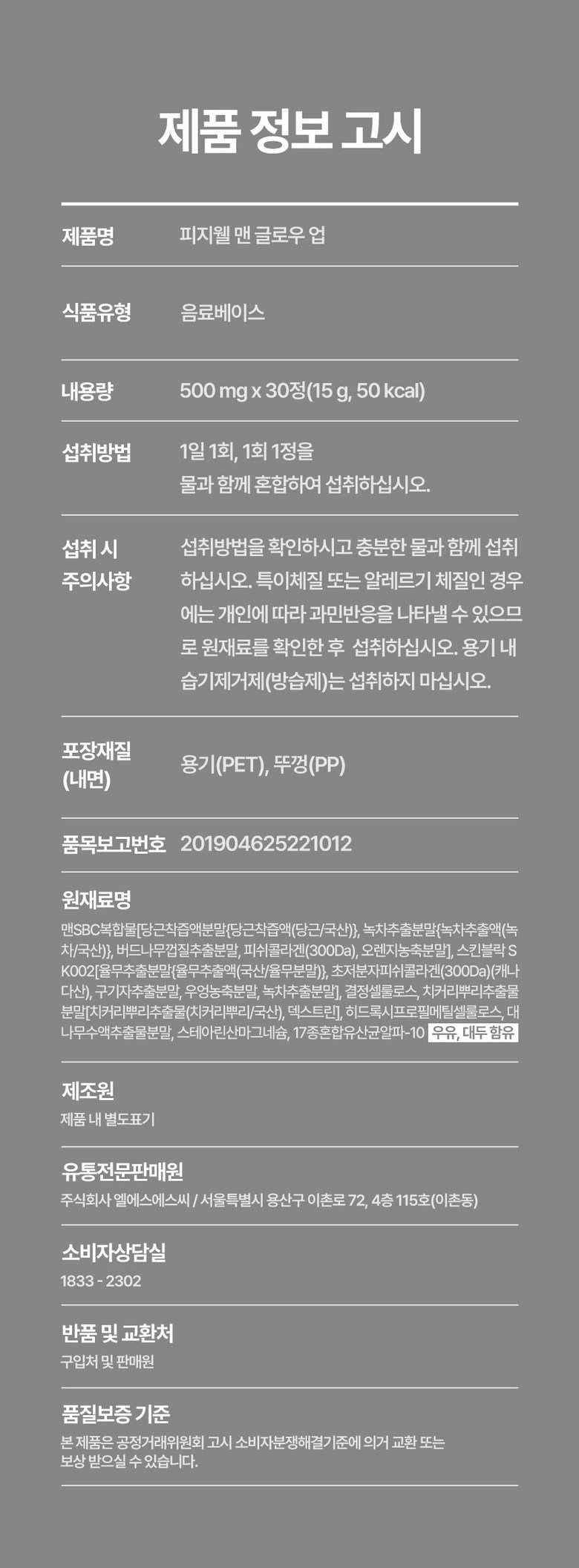 | 제조연월일, 유통기한 또는 품질유지기한 | 상품 상세페이지 참조 | 포장단위별 용량(중량), 수량 | 상품 상세페이지 참조 |