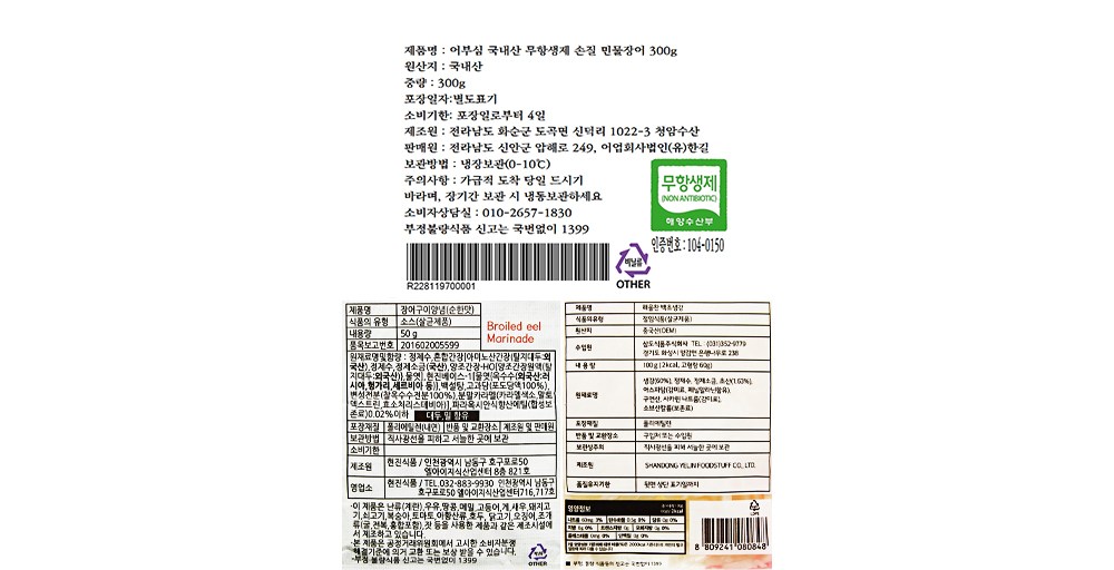 | 제조연월일, 소비기한 또는 품질유지기한 | 주문일 기준으로 제조 또는 포장되므로 해당 정보가 매번 변경되어 정확한 정보 제공이 어렵습니다. 정확한 제조연월일을 확인하시려면 쿠팡 고객센터(1577-7011)로 문의 바랍니다. | 세부 품목군별 표시사항 | 장어: 농수산물 : 유전자변형(해당 없음) / 지리적 표시사항(해당 없음) |그외: 해당없음 |