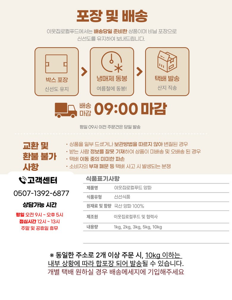 | 배송방법 | 신선/냉장/냉동 | 배송비 | 무료배송 · 도서산간 추가 배송비 - 제주 지역: 3,000원 - 도서산간 지역: 6,000원 |