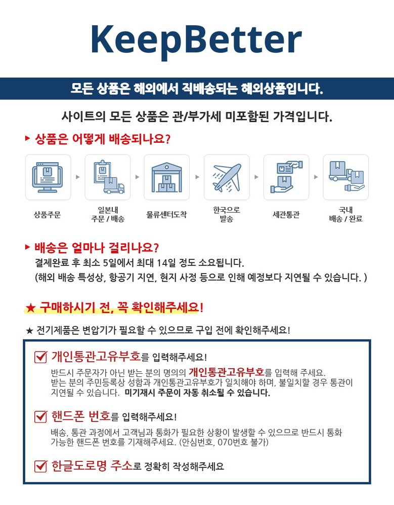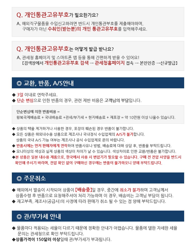 - 주문일 기준 동일 판매자 총 구매 금액이 면세 한도 초과 시 관부가세가 부과될 수 있습니다.