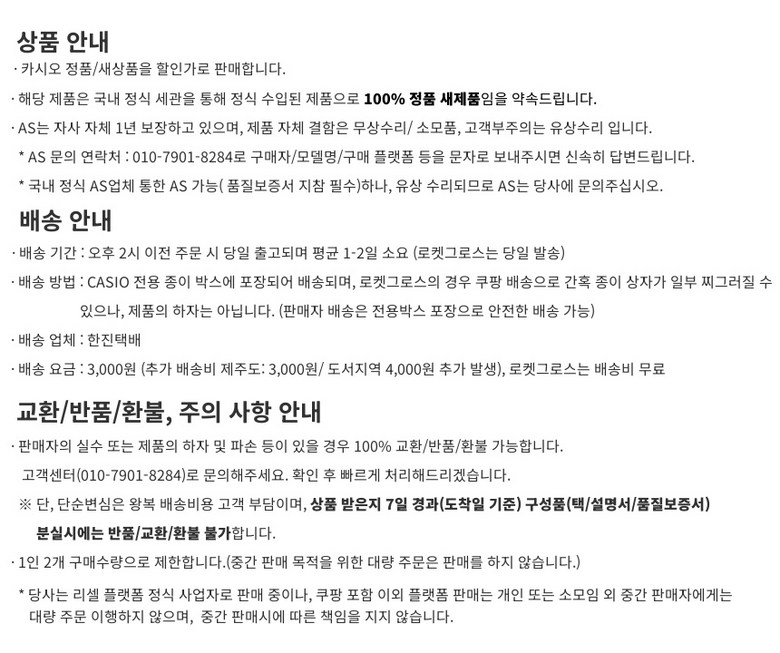 | 소비자상담 및 교환반품 문의 | 쿠팡고객센터 1577-7011 배송 및 환불/교환에 대한 문의는 마이쿠팡-고객센터 내 상담하기를 이용해주세요. | ||