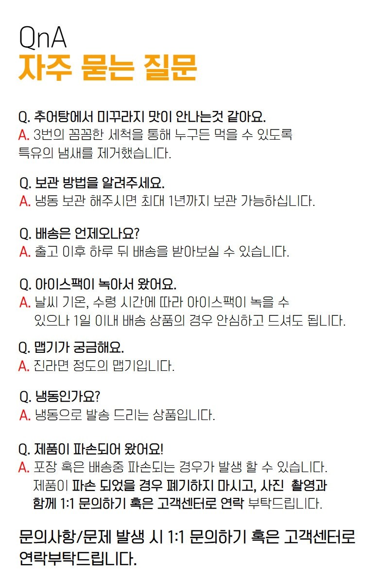 | 제조연월일, 소비기한 또는 품질유지기한 | 제조연월일:상시제조유통기한:제조일로부터 냉동보관 1년 | 세부 품목군별 표시사항 | 상품 상세페이지 참조 |