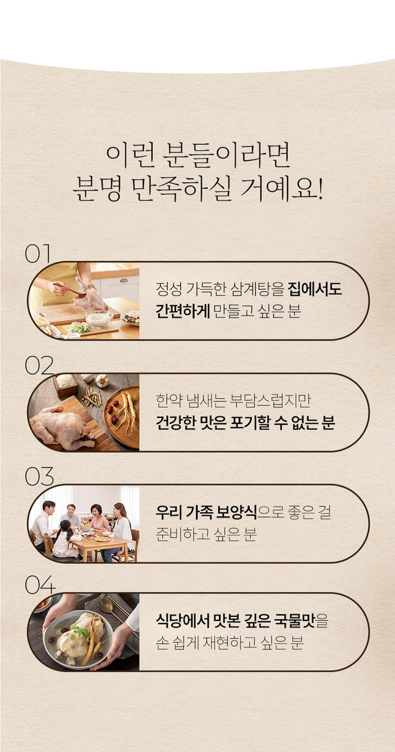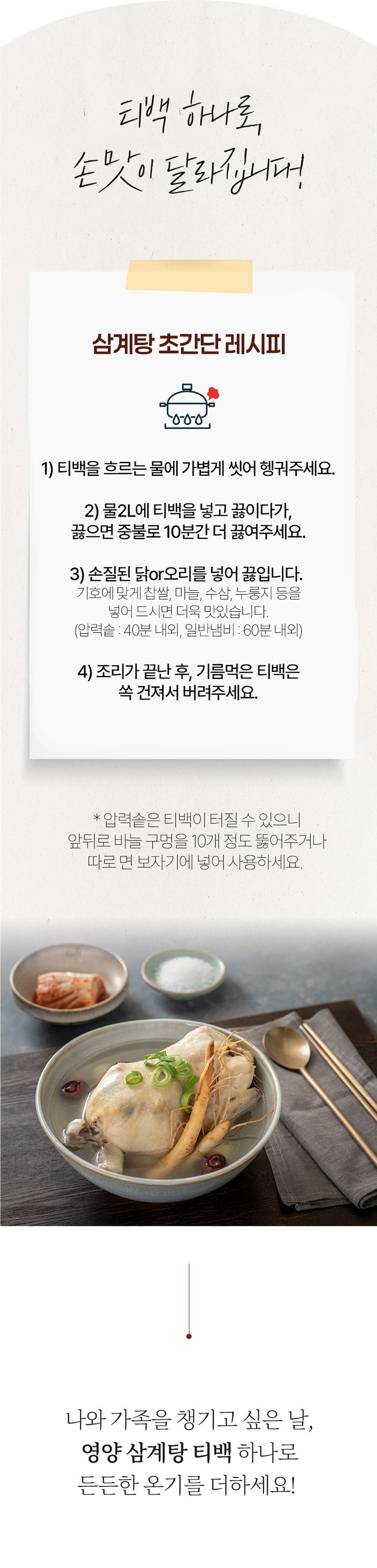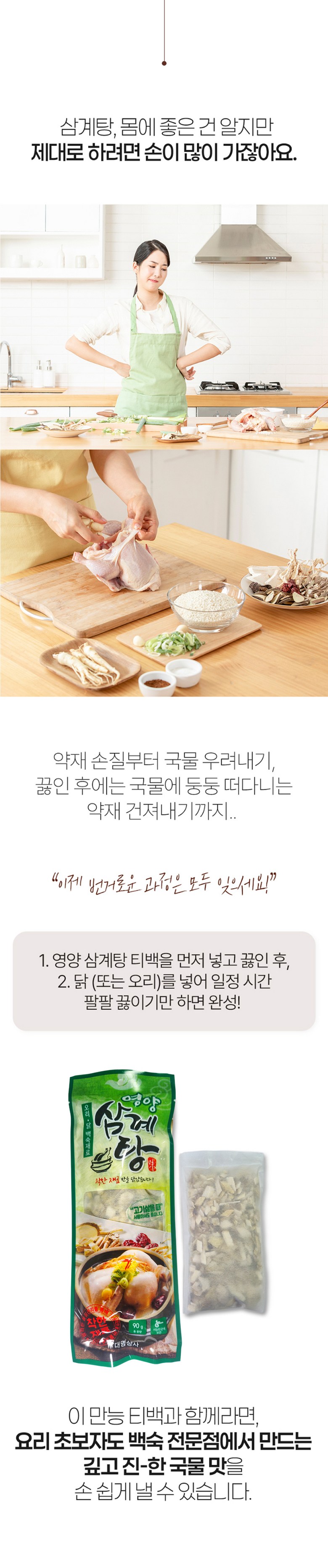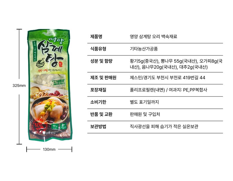 | 품목 또는 명칭 | 영양 삼계탕 오리 백숙재료 | 포장단위별 내용물의 용량(중량),수량,크기 | 90g, 1개, 120x320x40 |