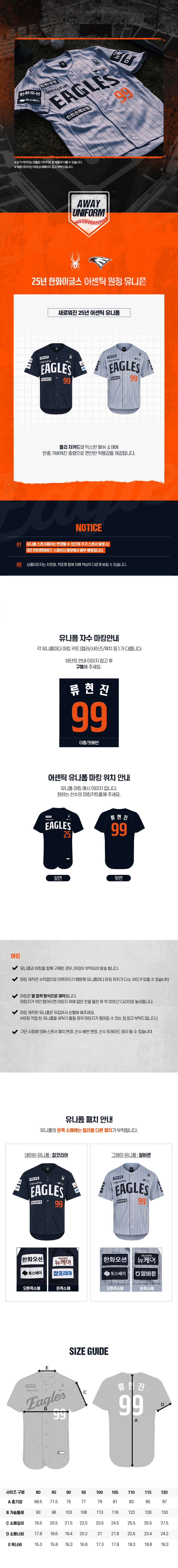 스파이더 한화이글스 25년 어센틱 원정 유니폼 티셔츠