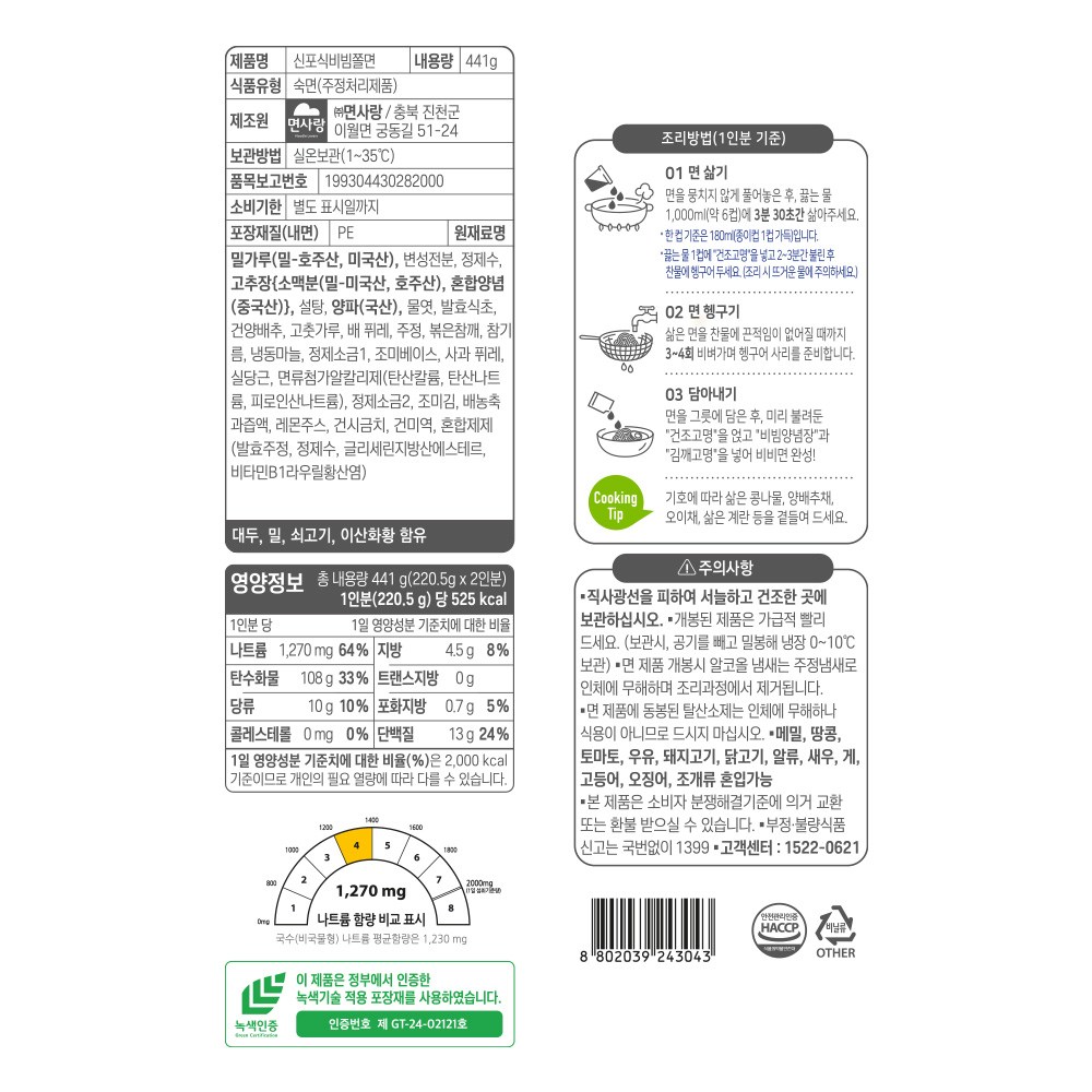 | 포장단위별 내용물의 용량(중량), 수량 | 441g, 2개 | 원재료명 및 함량 | 컨텐츠 참조 |