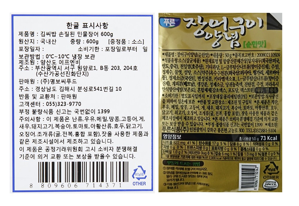 | 제조연월일, 소비기한 또는 품질유지기한 | 주문일 기준으로 제조 또는 포장되므로 해당 정보가 매번 변경되어 정확한 정보 제공이 어렵습니다. 정확한 제조연월일을 확인하시려면 쿠팡 고객센터(1577-7011)로 문의 바랍니다. | 세부 품목군별 표시사항 | 민물장어: 농수산물 : 유전자변형(해당 없음) / 지리적 표시사항(해당 없음) | 양념: 해당없음 |