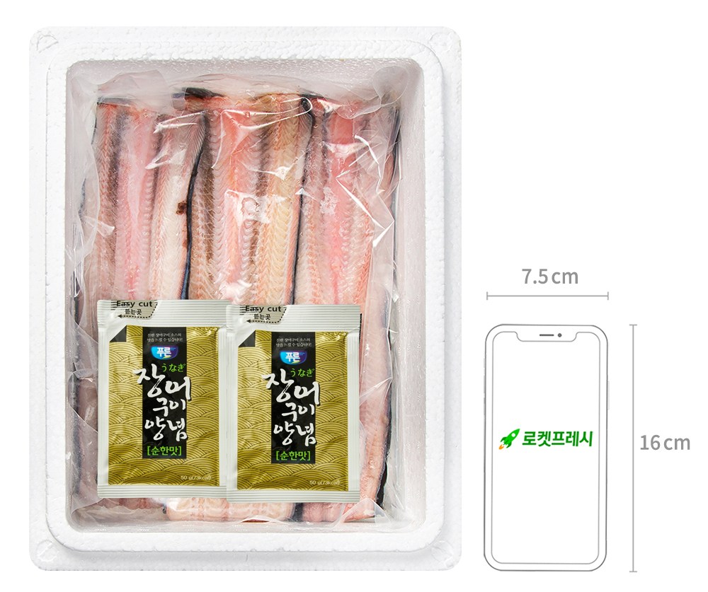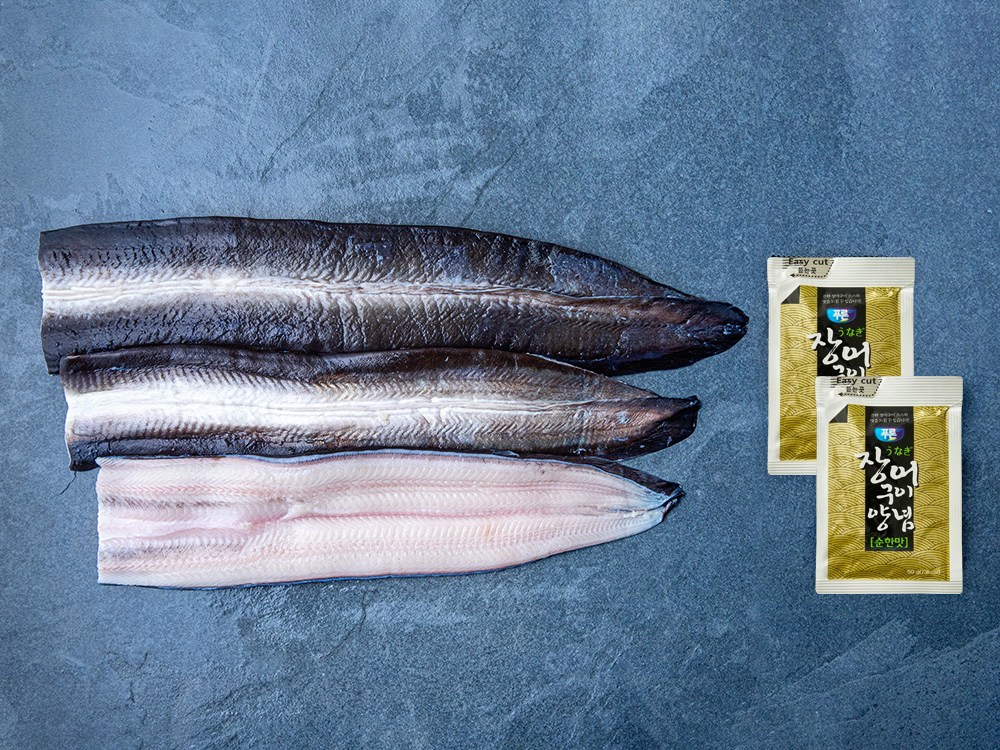 손질된 민물장어, 장어구이 소스(순한 맛)로 구성되어 있습니다.