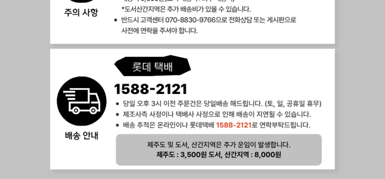 | 배송방법 | 순차배송 | 배송비 | 무료배송 · 도서산간 추가 배송비 - 제주 지역: 3,500원 - 도서산간 지역: 8,000원 |