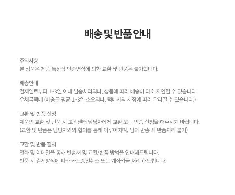 - ㆍ교환/반품에 관한 일반적인 사항은 판매자가 제시사항보다 관계법령이 우선합니다.