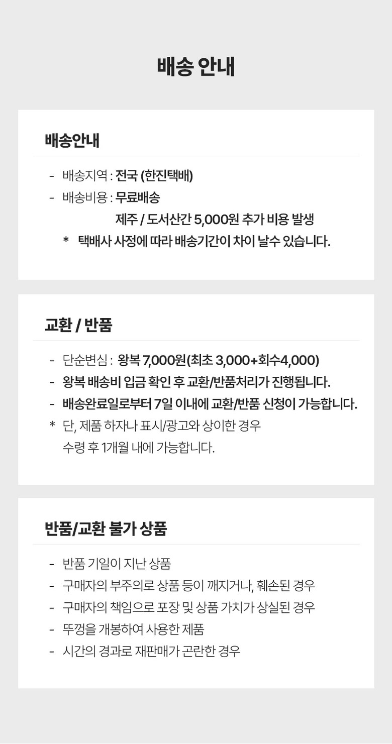 | 교환/반품 비용 (왕복비용) | 7,500원 - 단, 고객 변심의 경우에만 발생 - 도서산간 및 일부 지역 추가비용 발생 |