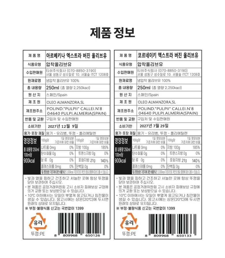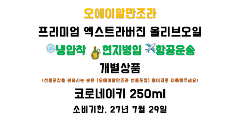 | 품목 또는 명칭 | 코르네이키 엑스트라버진 올리브유 | 포장단위별 내용물의 용량(중량),수량,크기 | 250ml |