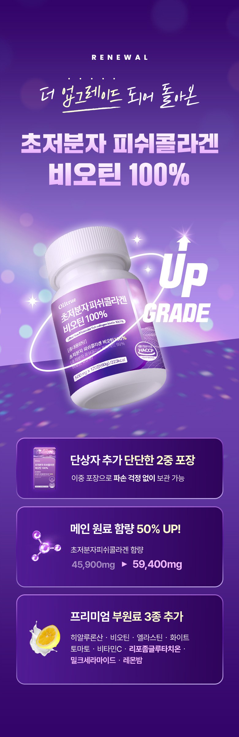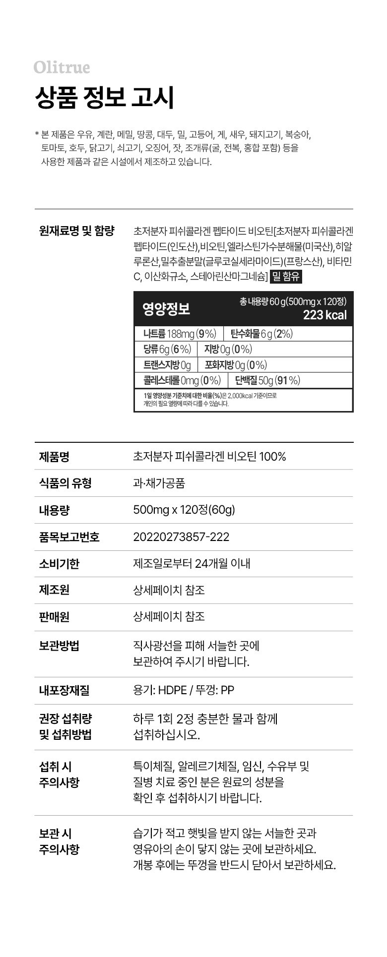 | 제품명 | 올리트루 저분자 피쉬콜라겐 펩타이드 비오틴 | 제조업소의 명칭과 소재지 | 올리트루 협력사 |