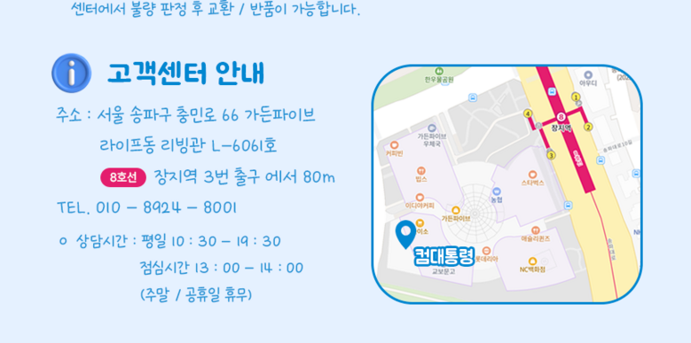 | 교환/반품 비용 (왕복비용) | 8,000원 - 단, 고객 변심의 경우에만 발생 - 도서산간 및 일부 지역 추가비용 발생 |