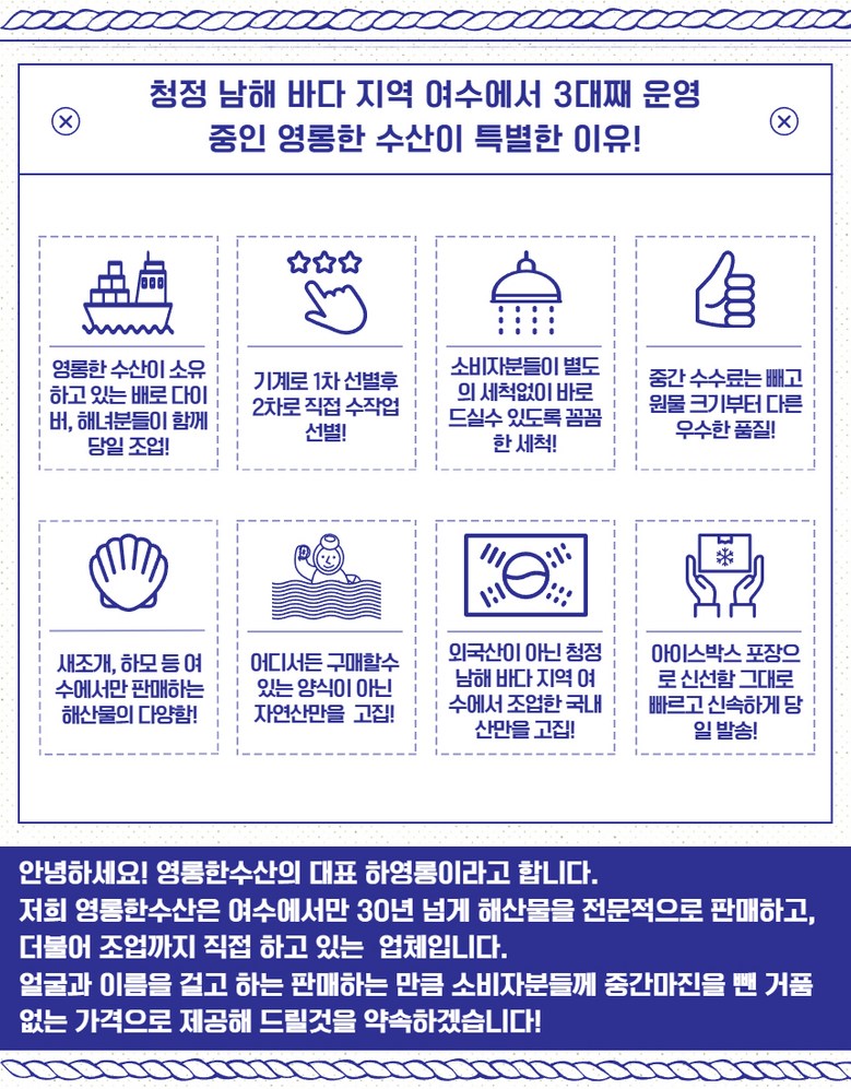 상호/대표자 | 영롱한수산 / 하영롱 | 사업장 소재지 | 전라남도 여수시 돌산읍 평사양지길 82-1 영롱한수산 |